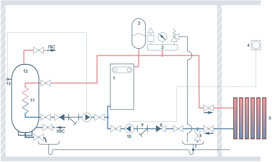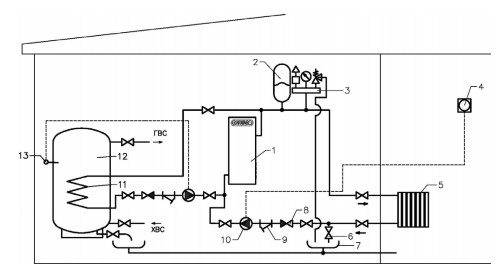 Схема обвязки: Электокотел с водонагревателем накопительного типа с внутренним трубчатым теплообменником