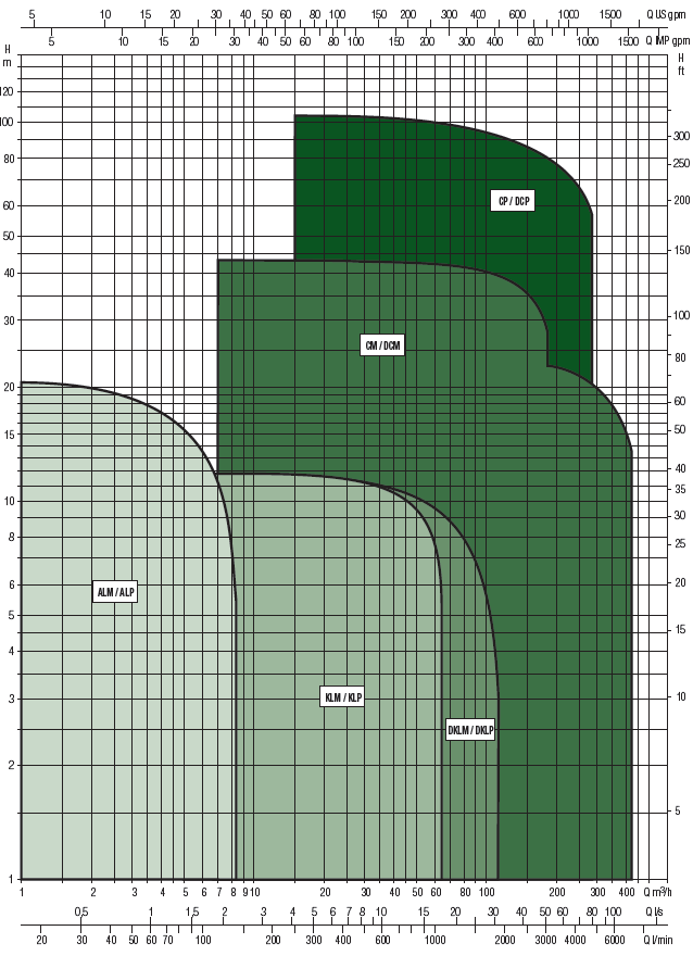 Конструктивные характеристики: Фланцевые всасывающий и напорный патрубки в исполнении PN 16 с резьбовыми отверстиями под манометры. Чугунные корпус насоса и опора двигателя, рабочее колесо из технополимера или чугуна (в зависимости от модели). Вал двигателя из нержавеющей стали. Асинхронный трехфазный двигатель, 4-полюсный, закрытого типа, с внешним воздушным охлаждением. Степень защиты: IP 55 Класс изоляции: F. Рабочий диапазон: от 1,2 до 420 м3/ч, с напором до 41 м.