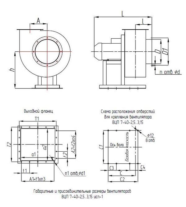 Габаритные и присоединительные размеры вентиляторов ВЦП 7-40 исп-1
