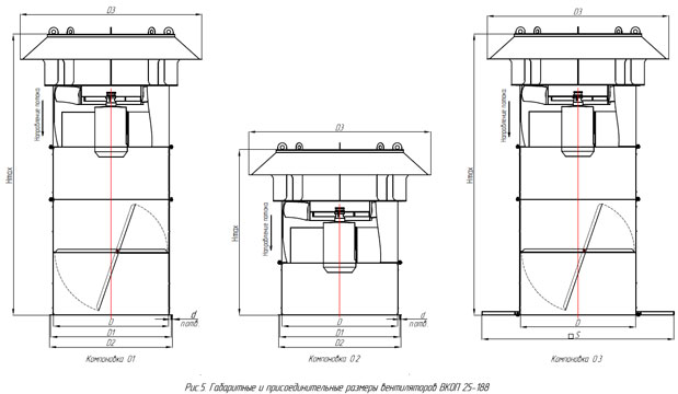 В крышных вентиляторах ВКОПв 25-188 в качестве осевых используются вентиляторы типа ВО 25-188. Входная часть агрегата выполнена в виде входной шахты, предотвращающей поступление атмосферных осадков в вентилятор и обслуживаемое помещение.