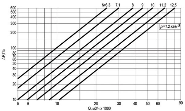 Технические характеристики вентиляторов ВКОП следует получать из индивидуальных характеристик соответствующих осевых вентиляторов (ВО 25-188) с уменьшением создаваемого вентилятором давления на величину потерь давления во входной шахте. Потери давления во входной шахте для вентиляторов разных типоразмеров приведены на графике.