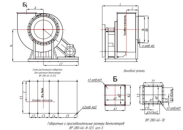 Габаритные и присоединительные размеры вентиляторов ВР 280-46 исп-1