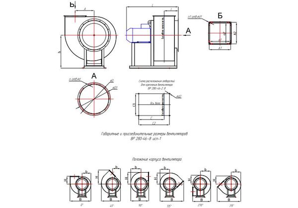 Размеры, зависящие от положения корпуса вентиляторов ВР 280-46 исп-1