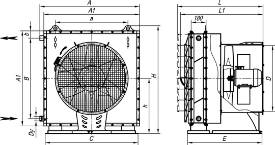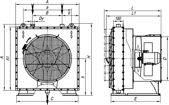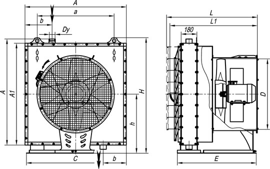 Одноструйные отопительные агрегаты выпускаются в моноблочном исполнении. Основными элементами конструкции являются паровой или водяной калорифер и вентилятор осевого типа, размещенные на единой опорной раме и соединенные между собой металлическим воздуховодом.