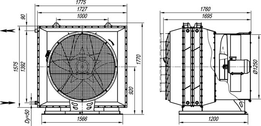 Габаритные размеры агрегата воздушно-отопительного АО 2-50 на базе двух водяных калориферов КСк 3-12