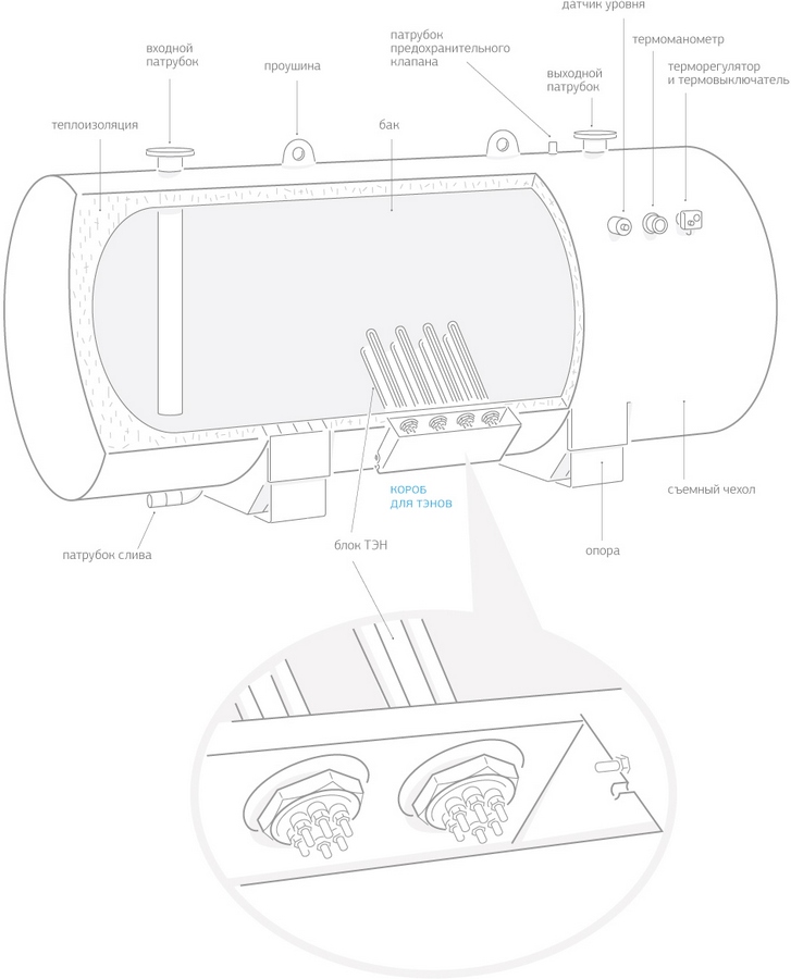Корпус емкости водонагревателя и нагревательные элементы изготовлены из нержавеющей стали и рассчитаны на длительный срок эксплуатации. При применении водонагревателя для нагрева воды для технологических нужд производства корпус может быть изготовлен из углеродистой стали. Снаружи емкость изолирована высококачественной теплоизоляцией, сверху защищена полимерной пленкой.