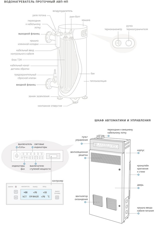 Шкаф автоматики и управления водонагревателя имеет встроенный контроллер, обеспечивающий плавное регулирование температуры и автоматический выбор требуемой мощности. Шкаф автоматики и управления обеспечивает многоступенчатую защиту, как каждого нагревательного элемента, так и всего водонагревателя в целом по всем возможным параметрам.