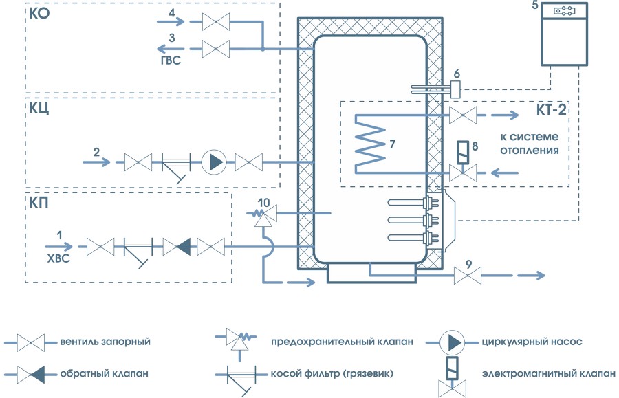 Схема обвязки водонагревателя с внутренним трубчатым теплообменником и блок ТЭНами