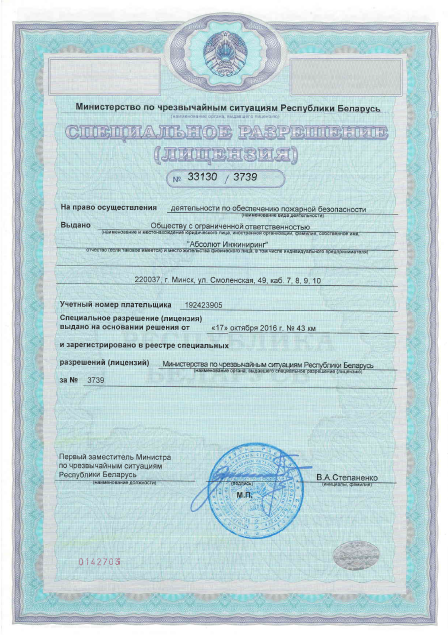 С гордостью сообщаем о получении нашей компанией Специального разрешения (Лицензии) МЧС Республики Беларусь на право осуществления деятельности по обеспечению пожарной безопасности.